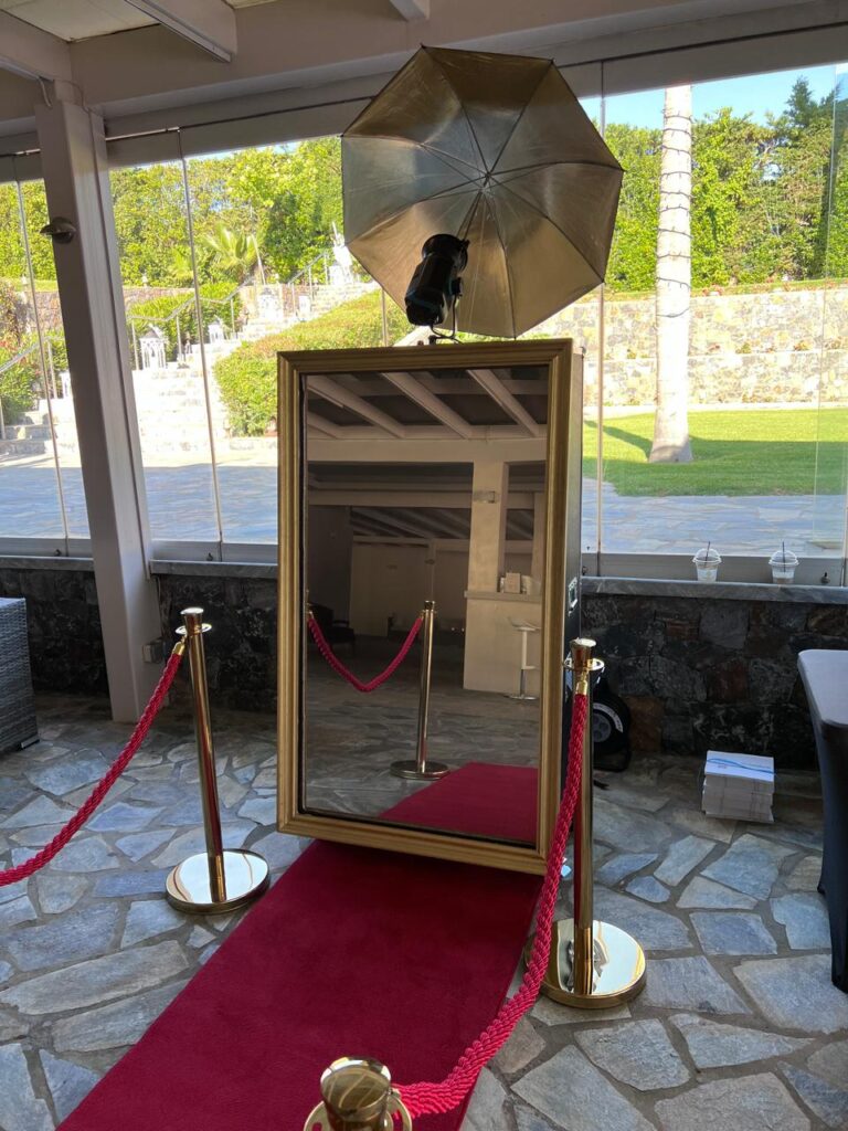 Το Mirror Photo Booth προσφέρει μια μαγευτική εμπειρία με μια πινελιά μαγείας και αίγλης, προσθέτοντας μια νέα διάσταση στη διασκέδαση που αιχμαλωτίζει κάθε επισκέπτη, με κάμερα και εκτυπωτή τελευταίας τεχνολογίας.