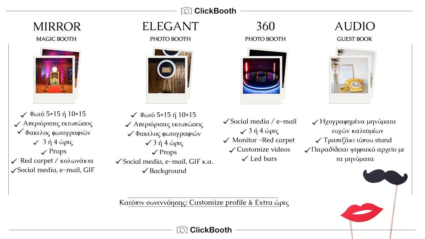 Προσθέστε μια ιδιαίτερη πινελιά στην εκδήλωσή σας με το Elegant Photo Booth για γάμους, βαπτίσεις, parties και events. Απολαύστε μια ποικιλία χρωμάτων, φίλτρων και εντυπωσιακών κορνιζών, προσβάσιμων μέσω μιας εύχρηστης οθόνης αφής. Οι φωτογραφίες είναι άμεσα διαθέσιμες για εσάς και τους καλεσμένους σας.